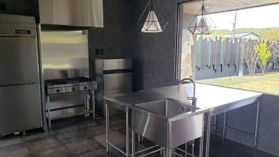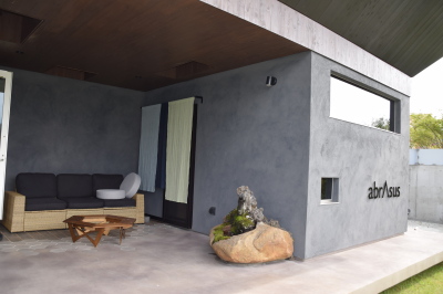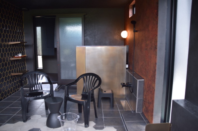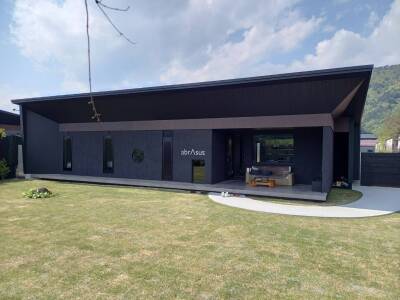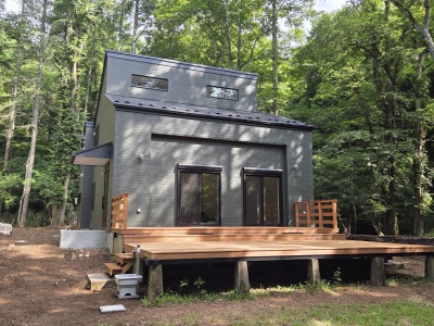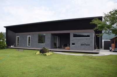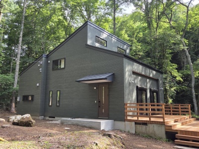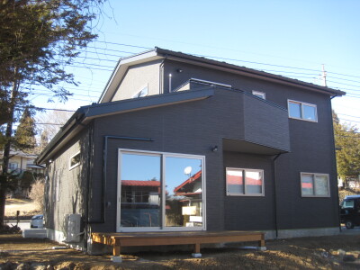 建物完成です。 外部にウッドデッキも取り付けました。 全体に黒色をベースとして施工しました。 |