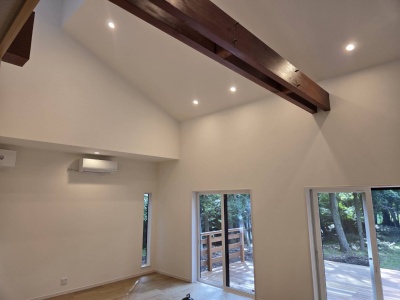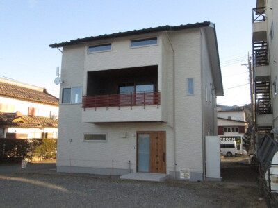 完成いたしました。 無事引き渡しも終わりました。 外観もバルコニー手摺りを木製ルーバーで仕上げました。 |