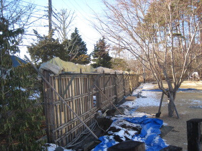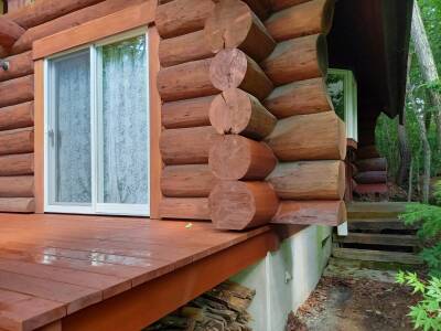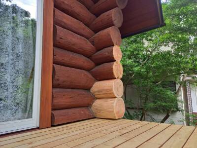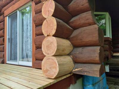 ハンドログのノッチ部分が腐食して補修しました。 丸太の径は300㎜有ります。 大工さんの腕の見せ所でした。 |