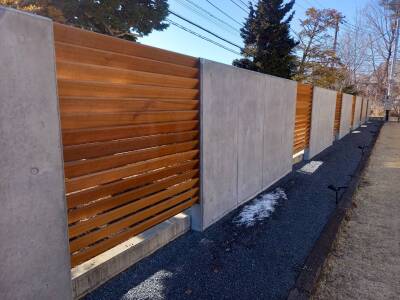 境界壁をRCと木製ルーバーで構成してみました。 RCだけではただの擁壁になってしまうので木製ルーバーを使用しました。 木製ルーバーも腐らないセランガンバツ材を使用しました。 木製ルーバーもルーバーのみを見せたくRCに溝を作り上から落としました。 |