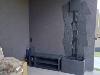 ベンチの横に鉄平石を貼り水を上から流し瀧をイメージして施工しました。 水音が何とも言えません。 |