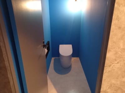 | トイレ内の壁と天井は鮮やかな青色に仕上げた中に白い陶器を設置しました。 |