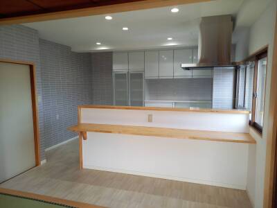 今回の改修工事で対面キッチンに変更してリビングと一体化しました。 対面キッチンにする事によってガスコンロを使用する為、窓側に不燃材下地にステンレスを張り対策しました。 改修前はブラインドをしめっきりだったのをプラマートUのペアー硝子型で断熱と明かりを重視しました。 |